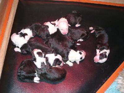 Leute, Mama und wir hatten uns das vorher so ausgemacht. Nachdem ja unsere älteren "Geschwister" des A-Wurfes bereits Sonntagskinder waren, wollten wir natürlich auch welche werden. Aber da wir ja so viele sind und der Sonntag, den wir uns ausgesucht hatten, Mamas 65. Trächtigkeitstag war, war es nicht ganz so einfach für sie. Immerhin hatten wir (ohne Fruchtwasser und Nachgeburten) zusammen 3.236 Gramm Lebendgewicht. Aber sie hat das ganz toll weggesteckt. Das Gewicht und die 9 Stunden, die die Geburt gedauert hat. (Herrchen und Frauchen waren da sicher mehr geschafft). Als erster kam um 15.48 Uhr Nr. 1 (ein Rüde) mit 395 Gramm zur Welt. Dann kamen in teilweise recht großen Abständen die Nummern 2, 3, 4, 5 und 6 .... alles Mädels: 16.08 Uhr - Hündin 322
