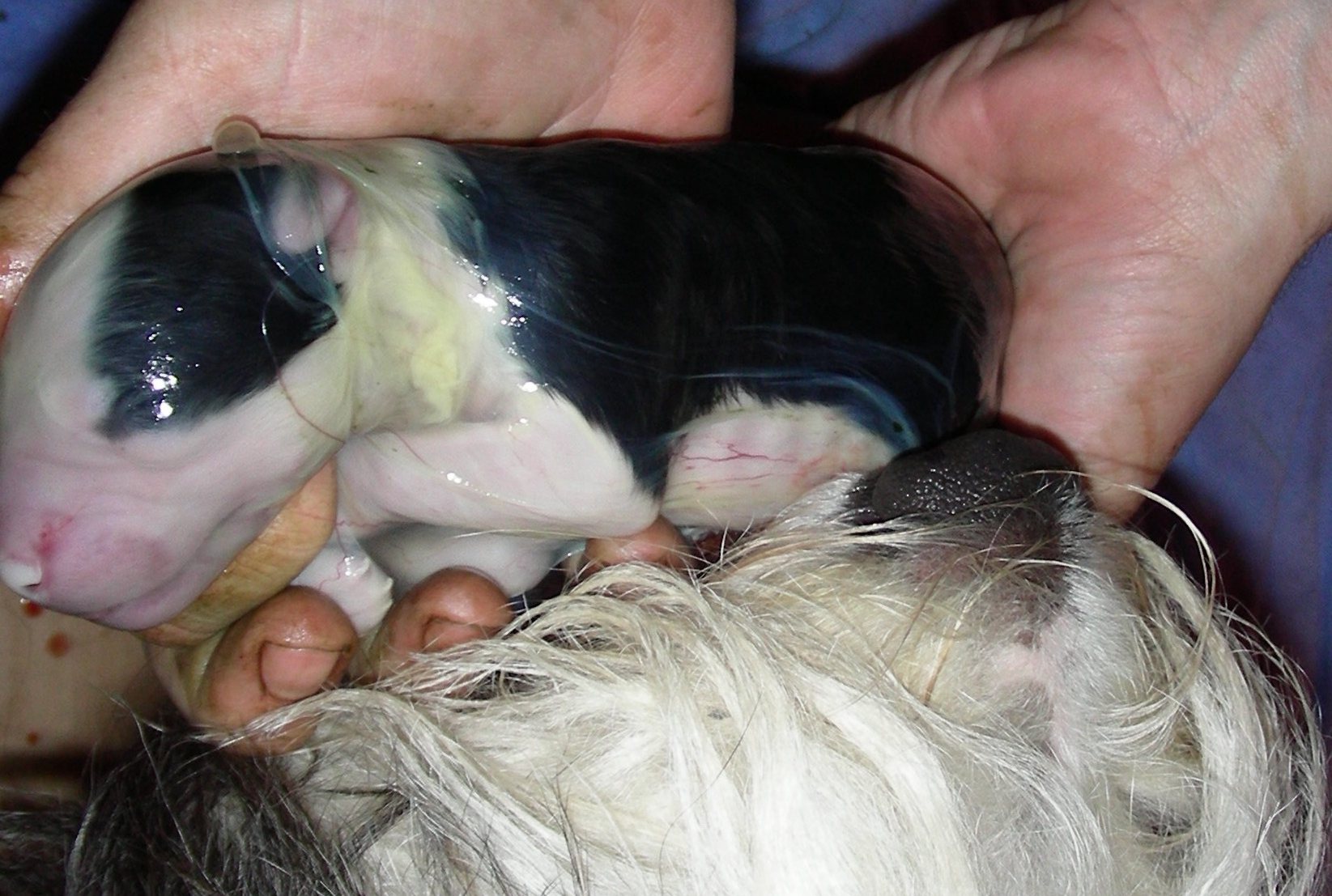 Dieses ganz besondere Foto hat Adrian während der Geburt von Bushwagger's Dragonheart (29.01.2008, 20.59 Uhr) gemacht. Der kleine Rüde ist noch vollständig in der Eihaut eingepackt. (Bild kann durch Anklicken vergrößert werden) |