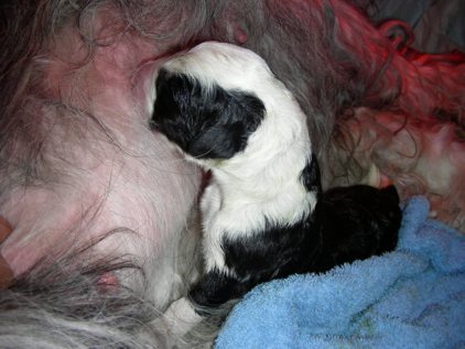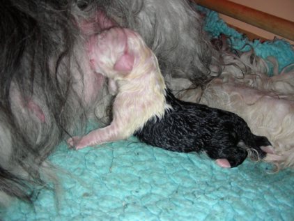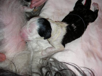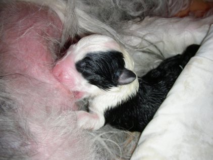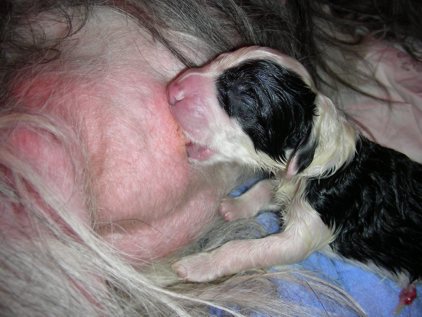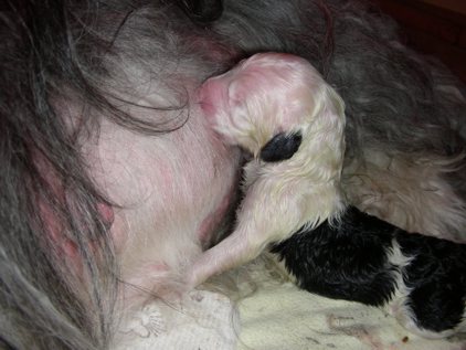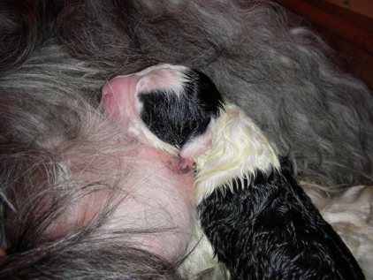 na das war ein ganz schönes Stück Arbeit ... und gedauert hat es über 11 Stunden. Aber es hat sich gelohnt - 8 wunderschöne Babys hab ich jetzt - drei Jungs und fünf Mädels - insgesamt 4,4 Kilogramm tolle kleine Hunde. Die Einzelgewichte von 445 bis 647 Gramm sind auf jeden Fall nicht von schlechten Eltern. Und auch sonst sind wir alle sehr, sehr, sehr zufrieden mit dem Resultat. Rechts dieses ganz besondere Foto hat Adrian während der Geburt des zweiten Rüden gemacht, der noch vollständig in der Eihaut eingepackt ist. Wer mag, kann sich das Foto hier auch noch größer anschauen. Und hier folgen die Fotos, die Herrchen jeweils innerhalb von 15 Minuten nach der Geburt gemacht hat. Ich hab ihm zwar gesagt, er solle ein wenig auf meine Intimsphäre achten, aber das hat er mal wieder nicht gehört. Männer... kennste einen, kennste alle.