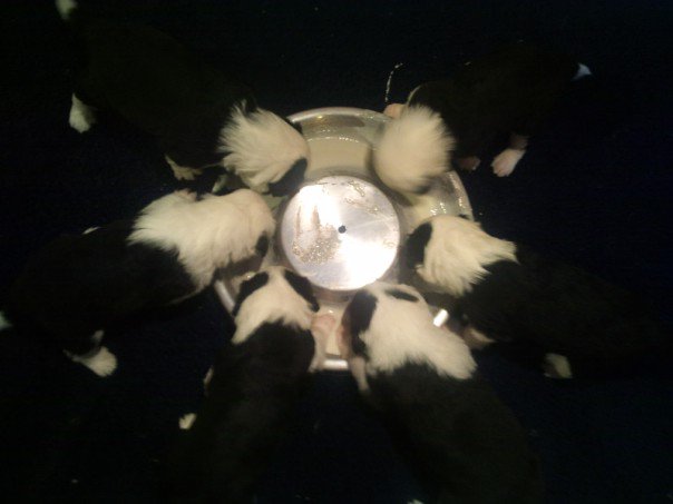 Zähne haben die Kinder bekommen und das tut manchmal ganz schön weh, wenn sie zum trinken kommen. Das Säugen geht mittlerweile besser, wenn ich stehen bleibe ... dann kann ich schneller flüchten, wenn sie anfangen zu knabbern. Das ist sicher auch der Grund, warum sie mittlerweile zwei- bis dreimal am Tag auch was anderes zu essen bekommen. Grießbei. Pomps Kindergrieß. Ganz schön verwöhnt, die Kleinen, findet ihr nicht auch? Und je mehr andere Dinge sie essen, umso weniger brauchen sie meine Milch. Mach ich halt künftig nicht mehr so viel davon. Auf die Dauer ist es auch sicher besser, wenn sie sich das abgewöhnen. Auch sonst tut sich viel. Der Auslauf im Wohnzimmer wird immer größer und Frauchen hat versprochen, dass wir spätestens in der nächsten Woche, wenn das Wetter so toll bleibt, alle gemeinsam im Hof und im Garten spielen dürfen. Ich freu mich drauf und erzähl es euch, wenn es so weit ist. Bis dann. Eure Mahina Bushwagger's Earth Wind and Fire - Foto vom 25.03.2011