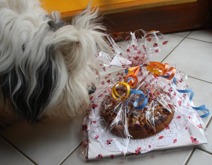 Welpenzeit ist Besuchszeit. Ganz ganz viele nette Leute kommen uns besuchen. Nachbarn und Freunde und andere Leute, die sich meine Babys anschauen wollen. Und natürlich auch mich. Ich bin zwar, seit die Babys da sind, nicht mehr die alleinige Hauptperson, aber doch ganz schön wichtig, glaube ich. Und die Leute bringen auch alle was mit. Mal Leckerli für mich, Mama, Oma und Onkel Angelo und mal Spielzeug für die Welpen. Wisst ihr eigentlich, dass die Kleinen ja eigentlich viiiiiel zu klein für die Quietschehühner und Teddybären sind, die hier so ankommen? Da muss ich ein Auge drauf haben, sicher sind die Sachen doch eigentlich auch alle für mich. Ich hab schon einen Vorrat angelegt und einiges heimlich bei meinem Kraken und meiner Stoffkuh versteckt. Sogar einen Kuchen habe ich bekommen. Einen selbstgebackenen Apfelkuchen mit sechs Kerzen drauf. Schaut selbst. Aber kaum hab ich einen Augenblick nicht aufgepasst, hat der Besuch gemeinsam mit Herrchen, Frauchen und Herrchen jr. den Kuchen selbst aufgegessen. Fand ich echt gemein. Was mich am meisten wundert, ist ja, dass manche Leute, die uns besuchen, sich meine Welpen ganz genau anschauen und mit ihnen spielen und kuscheln. Und erzählen, dass sie zuhause schon Vorbereitungen treffen für den Tag, wenn 'der neue Hund' da einzieht. Ich glaub, die vertun sich. Da zieht sicher niemand ein bei denen. Meine Kinder bleiben nämlich bei mir. Hab ich beschlossen.