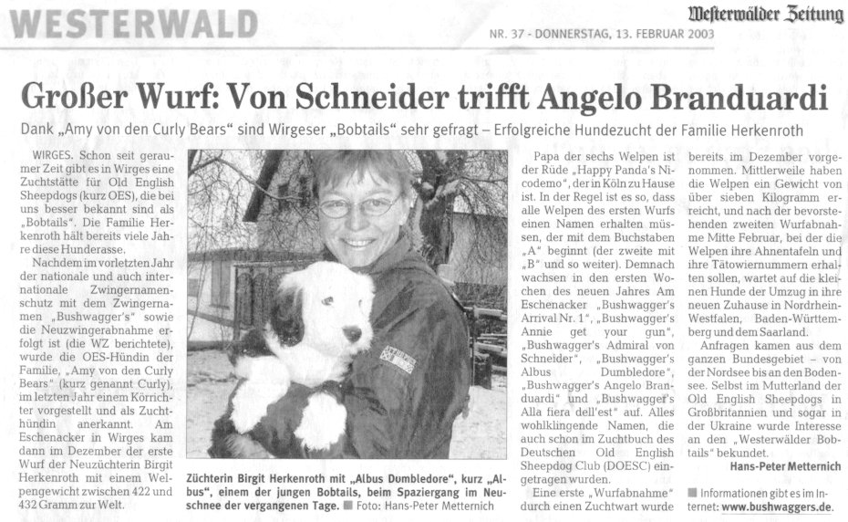 Hallo, Leute, wir sind berühmt. Das stand am 13. Februar 2003 in der Westerwälder Zeitung (Lokalausgabe der Rheinzeitung): Eure Bushwagger