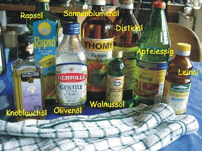 (Lein-, Sonnenblumen-, Distel-, Walnuss-, Knoblauch-, Oliven-, Rapsöl etc.),