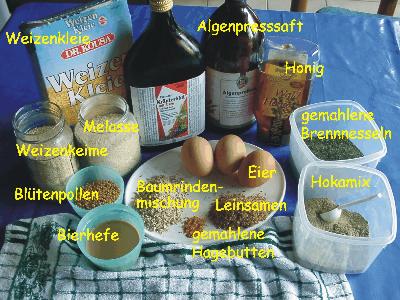 Weizenkleie, Blütenpollen, Baumrindenmischungen, Leinsamen, Brauerhefe,
