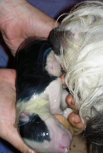 na das war ein ganz schönes Stück Arbeit ... und gedauert hat es über 11 Stunden. Aber es hat sich gelohnt - 8 wunderschöne Babys hab ich jetzt - drei Jungs und fünf Mädels - insgesamt 4,4 Kilogramm tolle kleine Hunde. Die Einzelgewichte von 445 bis 647 Gramm sind auf jeden Fall nicht von schlechten Eltern. Und auch sonst sind wir alle sehr, sehr, sehr zufrieden mit dem Resultat. Rechts dieses ganz besondere Foto hat Adrian während der Geburt des zweiten Rüden gemacht, der noch vollständig in der Eihaut eingepackt ist. Wer mag, kann sich das Foto hier auch noch größer anschauen. Und hier folgen die Fotos, die Herrchen jeweils innerhalb von 15 Minuten nach der Geburt gemacht hat. Ich hab ihm zwar gesagt, er solle ein wenig auf meine Intimsphäre achten, aber das hat er mal wieder nicht gehört. Männer... kennste einen, kennste alle.