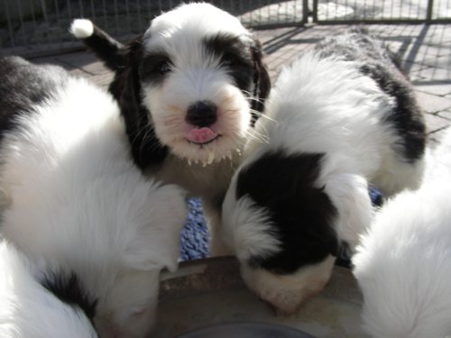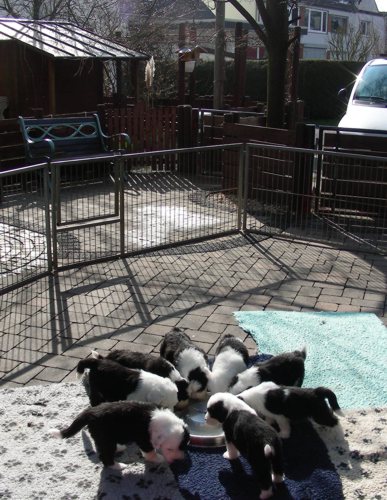 Und nach Sport, Spaß und Spiel schmeckt das Essen gleich doppelt so gut, besonders wenn es auf der Terrasse kredenzt wird. Vorgestern haben wir übrigens zum ersten Mal eingeweichtes und püriertes Futter bekommen und mittlerweile gibt's dreimal am Tag was - morgens Schmelzflockenbrei und nachmittags und abends vorm Schlafengehen je eine weitere Mahlzeit ...