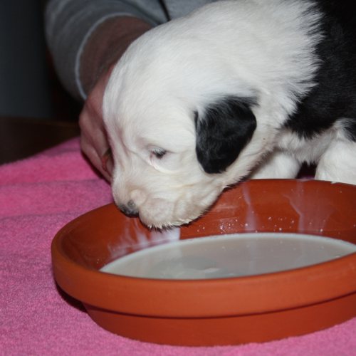 Gestern morgen fing es an. Wir schliefen noch, als die Bagger anrollten ... naja, so hörte es sich wenigstens an. Herrchen hat geräumt, geschraubt, gesteckt und geschoben und dann, ja dann war unsere Veranda fertig. Mit Sonnenliege und Aussicht ins Grüne. Und zur Feier des Tages kam unsere Uroma Curly zu Besuch. Das war toll. Aber damit noch nicht genug. Abends dann ging es genauso geheimnisvoll weiter. Diesmal war Frauchen an der Reihe. Sie räumte ihr bestes Essgeschirr (vielleicht war es auch das zweitbeste, ist aber auch egal) auf den Tisch und dann passierte es: Wir schlabberten - erst mal einer nach dem anderen - unsere erste Milchmahlzeit aus einem Schüsselchen. Zwei von uns mussten erst mal prusten und schnauben, weil Milch ins Näschen kam - und einer stellte sich gar mitten in die Milch hinein, aber es dauerte gar nicht lange und wir alle sechs leckten und schleckten, was das Zeug hielt. So als hätten wir nie etwas anderes gemacht. Herrchen hat Beweisfotos gemacht, die ihr unten auf der Seite sehen könnt. Mann, das war ein Tag. Jetzt sind wir groß. Bis bald. Eure sechs Bushwagger