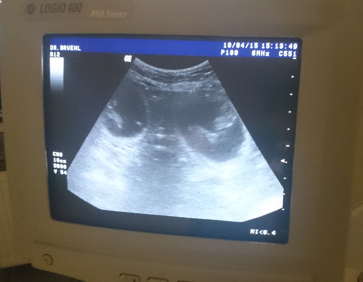 Hallo, ihr, einige haben gefragt, ob das Ultraschallbild vom letzten Eintrag echt sei. Nein, ist es nicht, zumindest nicht ganz, denn es war ja der 1. April. Zum einen war das Bild schon alt (ganz genau vom 11.08.2005, von Mamas erstem Wurf) und zum anderen wurden die Welpen darin natürlich von Herrchen reingebaut. Deswegen habe ich euch heute ein ganz aktuelles Bild vom gestrigen Tierarztbesuch mitgebracht, auf dem man ganz toll zwei meiner Babys erkennen kann. Ansonsten ist es im Augenblick hier so wie immer, wenn Welpen unterwegs sind. Es gibt besonders lecker zu essen, wir machen besonders tolle Spaziergänge und natürlich schreibt Herrchen wieder seine besonders langen Listen mit möglichen Namen - dieses Mal mit H. Hakuna Matata Aber wir kennen das ja - nachher werden sie doch wieder Hühnchen, Pünktchen und Püppy gerufen. Bis bald Eure Mahina |