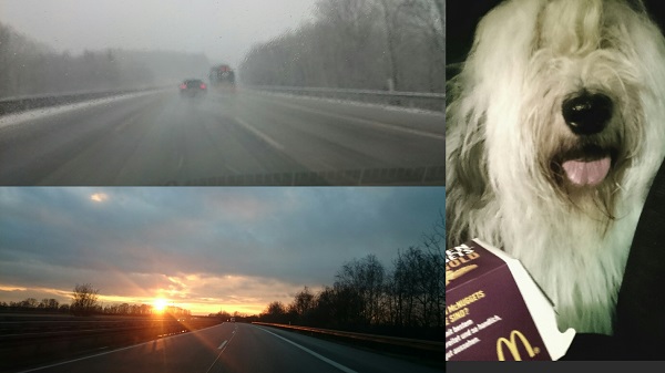 So war es dann auch. Und irgendwann kam nach der Mail nicht ein weiteres Warten, sondern Herrchen packte ganz aufgeregt das Auto und fuhr mit mir los ... in den Sonnenuntergang. Das heißt, zuerst war es Schneeregen, aber den Sonnenuntergang erlebten wir dann in einem Land, das er Holland nannte. Und bei einem tollen Bobtailherrn, den wir da besuchten. Vincent (Ch. Youandi Antaeus) heißt er. Ich kannte ihn schon von Mamas Erzählungen und er hatte uns ja vor einiger Zeit auch schon mal zu Hause besucht, aber jetzt empfing er uns in seinem Haus und in seinem Garten. Was da so alles geschah, da decke ich jetzt den Mantel des Schweigens drüber.