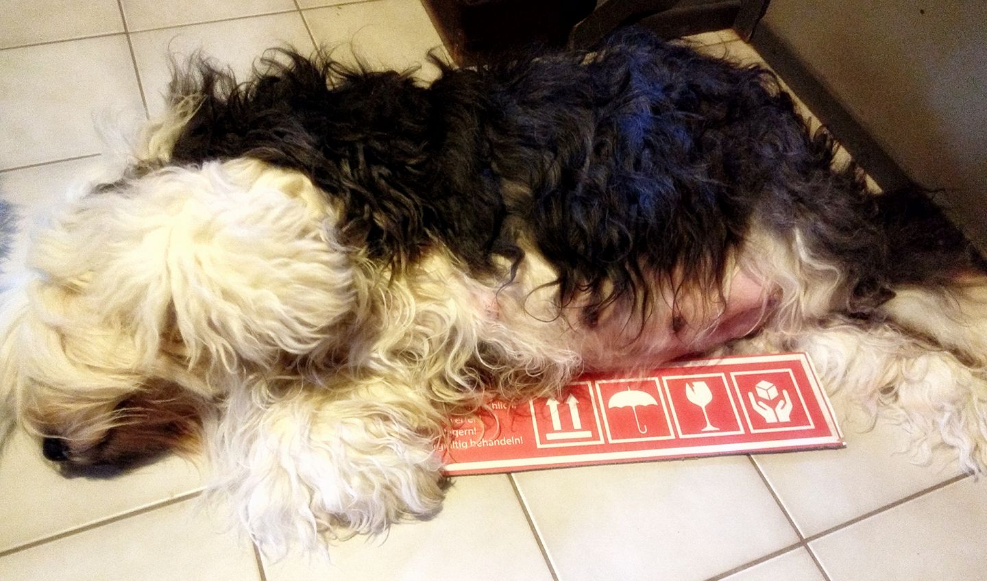 Sie fahren zu anderen Bobtails!!! Ja, ist das denn wahr? Und nicht nur das, sogar zu anderen Babys sind sie gefahren. Da müssen sie sich aber was einfallen lassen, damit ich das wieder vergesse. Gut, sie haben mich nicht alleine gelassen, immerhin waren Mama und Püppy und Herrchen junior zuhause, aber trotzdem - sich einfach ins Auto zu setzen und einen ganzen Sonntag wegzufahren, das ist nicht die feine englische Art. Ich soll mich nicht so anstellen, haben sie gesagt, das sei Dienst für den Club gewesen, aber das gehört sich doch nicht. Einfach loszufahren und fremde Welpen zu kuscheln, wo gibt es denn sowas? Wurfabnahme haben sie es genannt und dass sie Zuchtwarte seien, haben sie gesagt, aber ich nenne es Verrat an mir. Aber wenn ich mir die Fotos, die sie mitgebracht haben, so anschaue, freue ich mich noch mehr auf das, was mir und uns bevorsteht. Und dass der zweite Besuch ein Besuch bei meiner (Halb-)Schwester Söckchen war, macht es auch nicht besser. Das auf den Fotos, das ist Söckchen zusammen mit ihrem jungen Freund Peanut. Söckchen soll bald auch Babys bekommen, aber jetzt bin erst ich mal dran. Dauert gar nicht mehr lange. Höchstens noch eine Woche ... Eure Keeana P.S. Frauchen und Herrchen haben mich mit ganz vielen Leckerlis und StreichelDeinheiten davon überzeugt, dass alles das, worüber ich mich da oben beschwert habe, gar nicht so schlimm war. Das folgende Foto stammt von meinem 58. Schwangerschaftstag und trägt den bezeichnenden Titel "Handle with care".