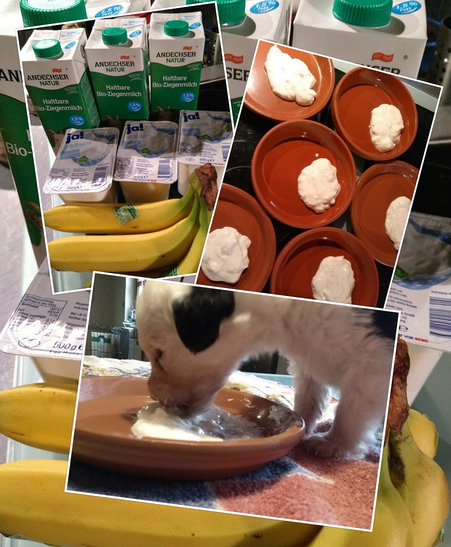 also essenstechnisch geht hier zur Zeit echt die Post ab. Das fing an mit Milch, die wir aus einem Schälchen schlabbern durften, um Mama ein wenig zu entlasten und unsere gestiegenen Bedürfnisse zu befriedigen. Später gab es gekochten Grießbrei und mittlerweile zusätzlich jeden Morgen Bananenquark, alles einzeln in Schüsselchen gereicht, damit wir alle das gleiche bekommen. Denn einige von uns sind sehr besonnene Esser und andere wiederum schaufeln los, als gäbe es kein Morgen mehr. Um zu vermeiden, dass die einen zu wenig bekommen und um den anderen zu zeigen, dass niemand ihnen ihr Essen wegnehmen wird, darf jeder einzeln essen.