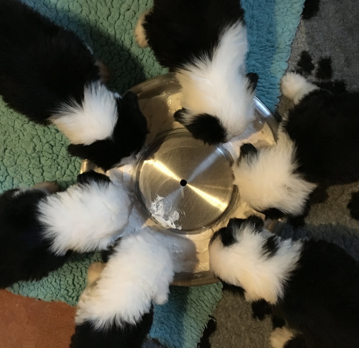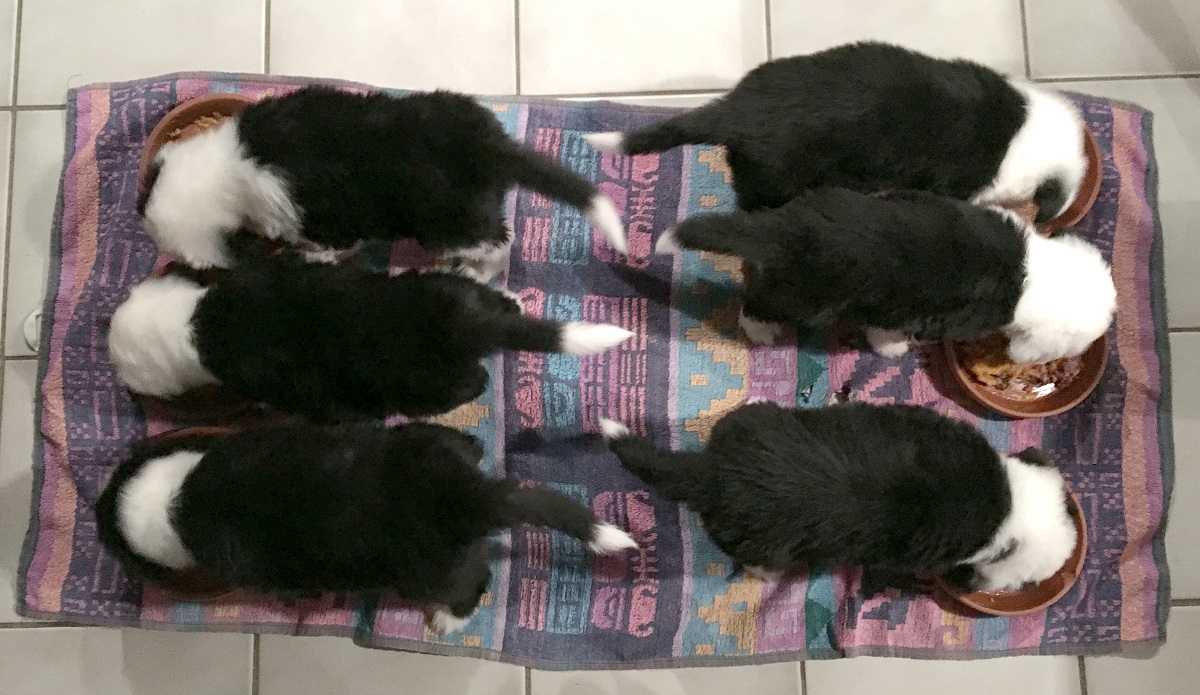 Ansonsten gibt es nicht allzu viel zu berichten. Wir spielen, schlafen und essen. Ah ja, essen ... unser Speiseplan wird immer vielfältiger. Es gibt mittlerweile vier Mahlzeiten am Tag - morgens Quark mit Banane und Ziegenmilch und dann drei Fleischmahlzeiten. Mal Lamm, mal Rindfleisch und mal Rinderherz. Immer mit Gemüse und Kräutern.Hier ein Auszug aus unserer Speisekarte (Mittagsmenü): Der Küchenchef empfiehlt: Mageres Rinderherz, fein gewolft, mit einem Jus aus Rinderblut und 30 Kräutern an Möhrchen-Apfel-Püree, mit Distelöl verfeinert. Den Quark gibt es aus dem Futterring, die übrigen Mahlzeiten werden auf Tellern gereicht.